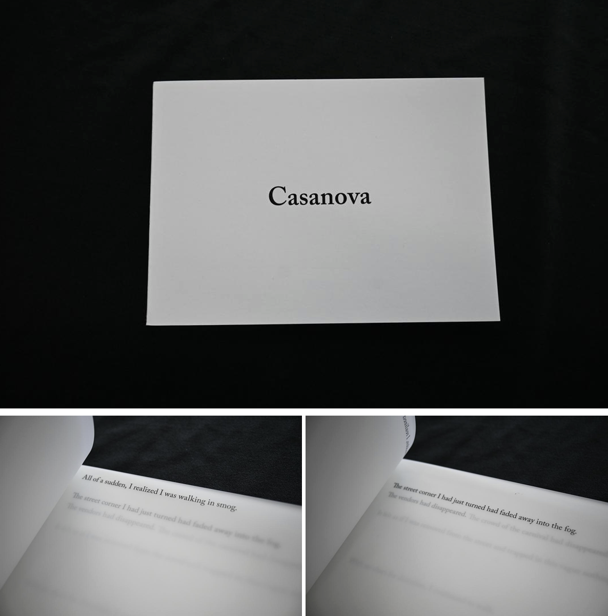Casanova tells a short fictional story of a dream, where the narrator meets Casanova at the Venice carnival. The story unfolds in a foggy surrounding through the reader advancing the vellum pages. One line of text is printed on each page, and the opacity of the vellum paper allows the reader to see about 2 lines of text at once. By advancing the pages, the text on the next page becomes clearer, simulating the experience of walking forward in a foggy environment with limited visibility.