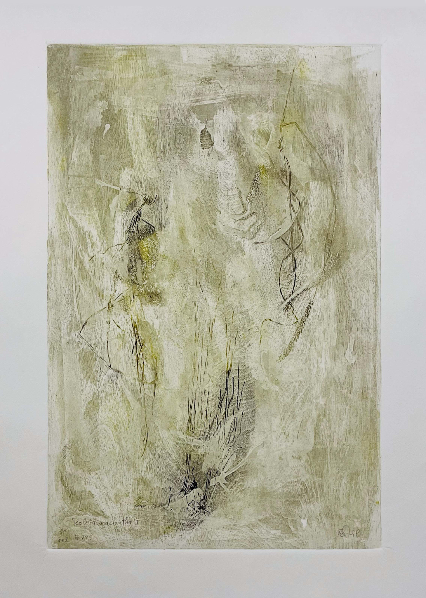 Much trial and error and a whole lot of frustration has led to a satisfying technique that she now calls her woodcut-intaglio. In this process, the plate is first prepared with water-based media that dries to a solid surface. This allows her to create a painterly ground with brushwork and textures. Once dry, she engraves and cuts into the plate (much like a woodcut) to get a detailed graphic image. The plate is then inked with oil-based inks and carefully wiped off again, much like in an intaglio or etching. Using an etching press with thick felt blankets to push the paper-fibre into all the matrix’s detailed carvings and textures, the plate is printed onto water-soaked high-grade 300gms Hahnemuhle copperplate paper.