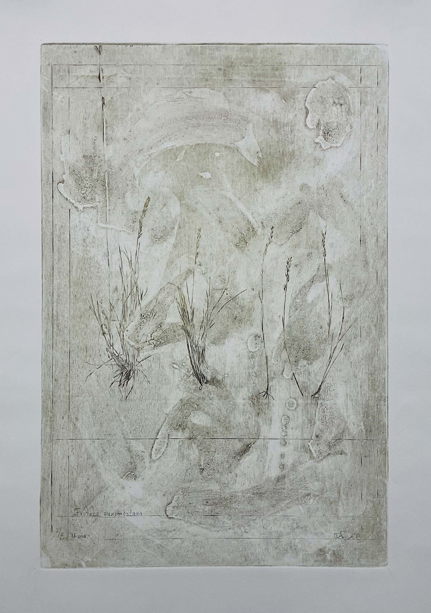 Much trial and error and a whole lot of frustration has led to a satisfying technique that she now calls her woodcut-intaglio. In this process, the plate is first prepared with water-based media that dries to a solid surface. This allows her to create a painterly ground with brushwork and textures. Once dry, she engraves and cuts into the plate (much like a woodcut) to get a detailed graphic image. The plate is then inked with oil-based inks and carefully wiped off again, much like in an intaglio or etching. Using an etching press with thick felt blankets to push the paper-fibre into all the matrix’s detailed carvings and textures, the plate is printed onto water-soaked high-grade 300gms Hahnemuhle copperplate paper.