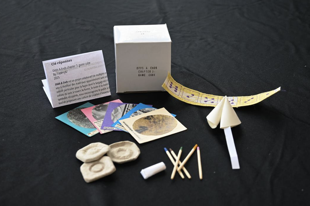 Odds & Ends is a collaborative artist’s multiples project by /ræk+ŋ4/ – Sabina Rak (ræk) and Hei Lam Ng (ŋ4). The project aims to repurpose seemingly worthless materials and turn them into new projects. With a focal interest in how language is constructed and used, we explore with this project how we make meaning through form, text, and materiality. By (re)assembling used materials and symbols, we encourage the audience to experience odd objects from different perspectives while considering a more sustainable artwork creation culture. Chapter 3: game cube is a collection of objects meant to provide “answers”. These objects take the form of gaming pieces such as: dice, coin, tarot card, origami fortune cookie, and Kau Chim sticks; while being redesigned with new symbols and meaning. The items are made of different repurposed materials such as paper, egg cartons, embroidery fabric, and packaging boxes. You, as a player, will pose questions and interpret the answers from these objects however you may operate them. While each piece is a token that gives “answer” by “chance”, the answers are only meaningful with the right question.